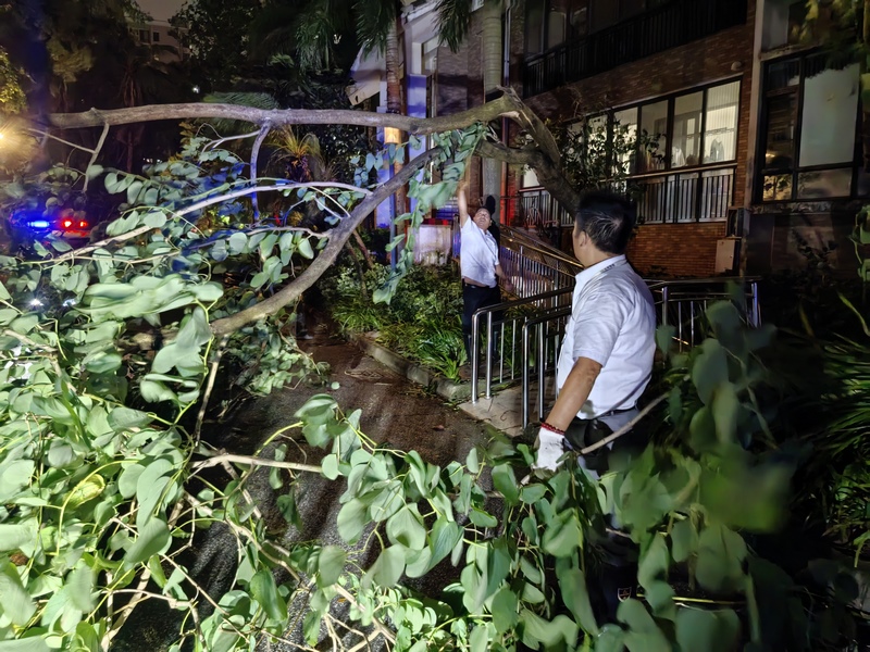 9月24日20时珠海市防汛防旱防风指挥部解除全市“五停” 措施后,世荣锦绣荣城安管主管刘炜主动扛起责任,带领队员连夜奋战在清障一线,面对小区内淤积的积水,他们及时排查排水隐患、高效疏通排水通道,快速消退积水;针对倒伏在车道上的树木,队员们手持工具精准切割、合力搬运,全力清除道路障碍。正是这股干劲,让小区业主的出行道路得以及时开辟,为后续全面恢复秩序打下基础。
